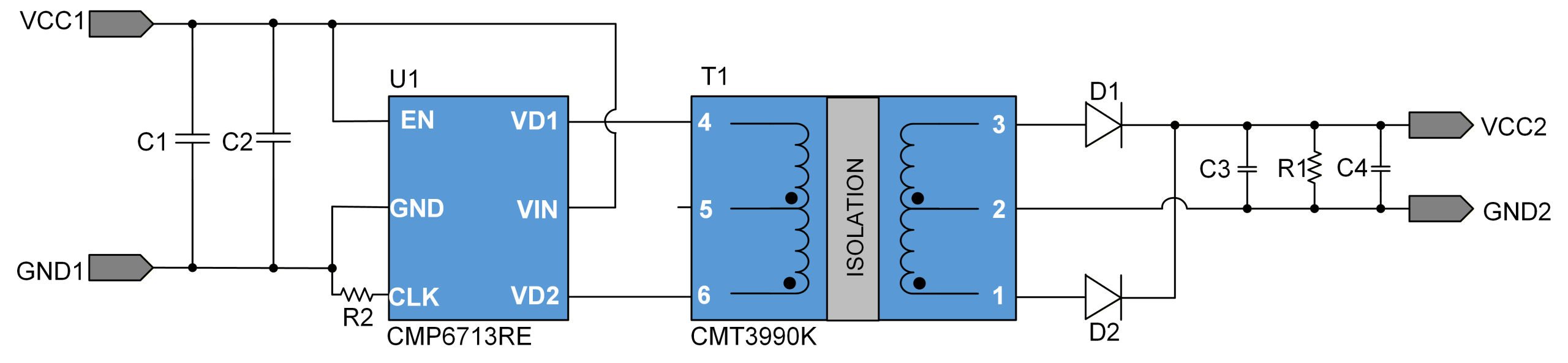 CMP6713RE+ CMT3990K是一款小型化的隔离电源方案。驱动器芯片和变压器配合必要的容阻和整流二极管,可以实现12V输入, 5V输出1W的隔离非稳压电源。