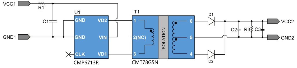 CMP6713R+CMT78G5N 是一款小型化的隔离电源方案。驱动器芯片和变压器配合必要的容阻和整流二极管,可以实现12V输入,5V输出2W的隔离非稳压电源。