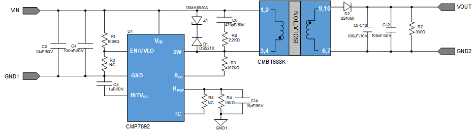 CMP7892+ CMB1688K 是一款小型化的隔离电源方案。芯片和变压器配合必要的容阻和整流二极管,可以实现 9-36V 输入,5V 输出 6W 功率的隔离稳压电源。