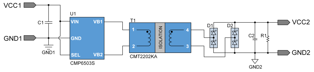 CMP6503S + CMT2202KA 是一款小型化的隔离电源方案。芯片具有三段频率选频功能,每个频段内都集成了扩频时钟,在多相供电场景下,可以提供进一步降低 EMI 辐射。驱动器芯片和变压器配合必要的容阻和整流二极管,可以实现5V输入,5V输出50mA的隔离非稳压电源。该方案可以实现非常紧凑的方案,PCB板占用面积小,适合隔离 485、隔离 CAN、和隔离ADC供电,特别是空间限制大的场合。