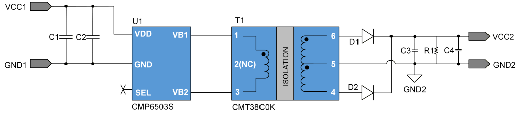 CMP6503S+ CMT38C0K 是一款小型化的隔离电源方案。芯片和变压器配合必要的容阻和整流二极管,可以实现 5V 输入,5V 输出 1W 功率的隔离电源。
