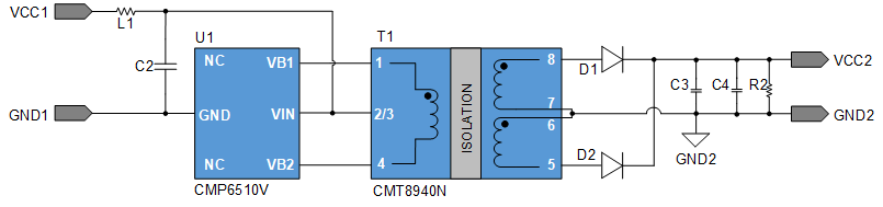 CMP6510V+ CMT8940N是一款小型化的隔离电源方案。驱动器芯片和变压器配合必要的容阻和整流二极管,可以实现5V输入, 5V输出3W功率的隔离非稳压电源。