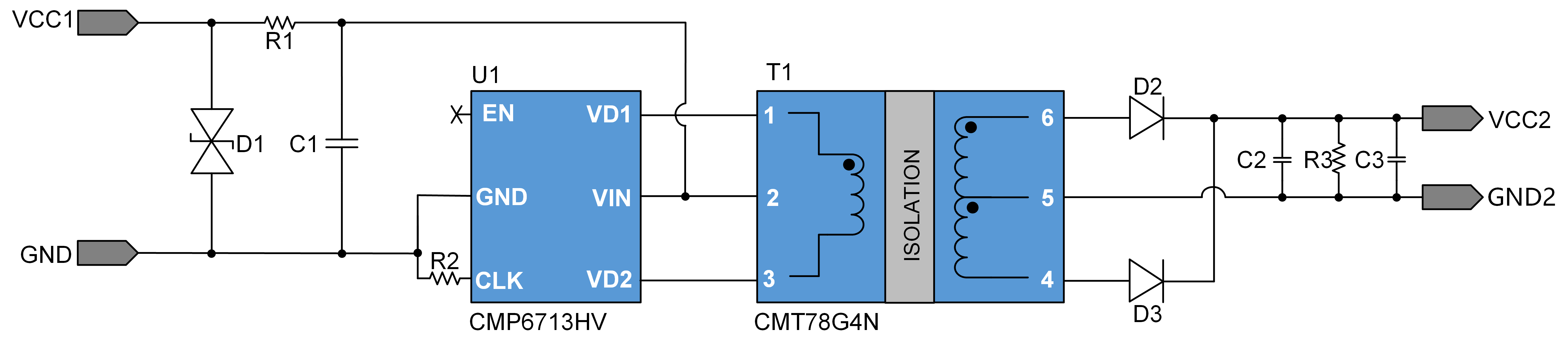 CMP6713HV+ CMT78G4N 是一款小型化的隔离电源方案。驱动器芯片和变压器配合必要的容阻和整流二极管,可以实现12V输入, 3.3V输出2W功率的隔离非稳压电源。