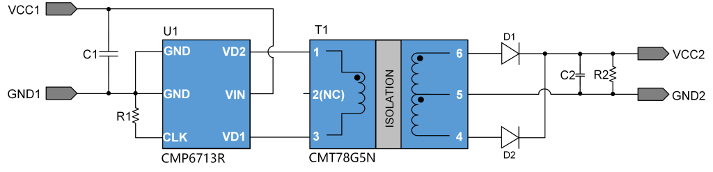 CMP6713R+CMT78G5N 是一款小型化的隔离电源方案。驱动器芯片和变压器配合必要的容阻和整流二极管,可以实现12V输入,5V输出2W的隔离非稳压电源。