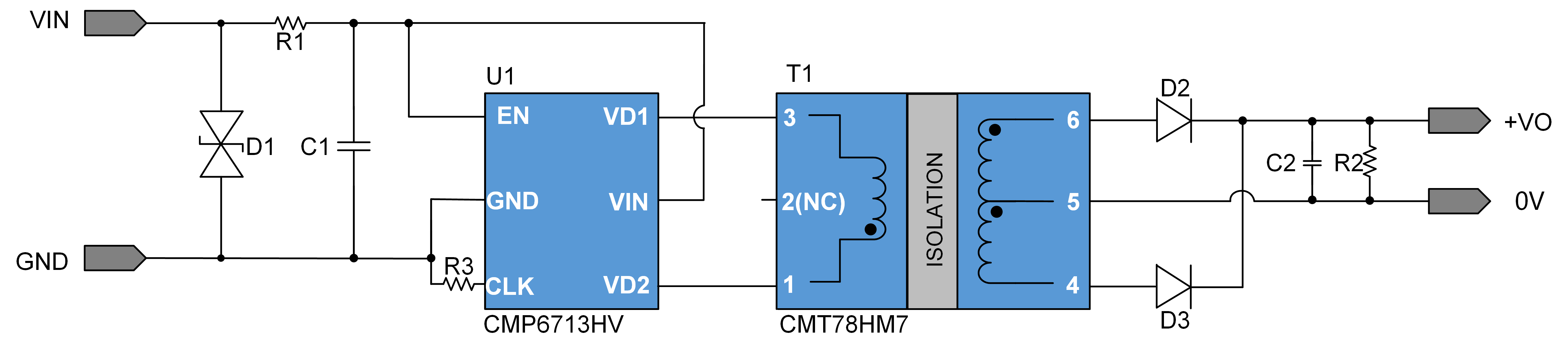 CMP6713HV+ CMT78HM7 是一款小型化的隔离电源方案。驱动器芯片和变压器配合必要的容阻和整流二极管,可以实现24V输入, 3.3V输出2W功率的隔离非稳压电源。该方案可以实现非常紧凑的方案,PCB 板占用面积小,适合隔离 485、隔离 CAN、和隔离 ADC 供电,特别是空间限制大的场合。同时兼容隔离耐压 1500VDC 的 B2403S-2W-6713HV-78HM7 方案。