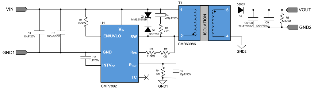 CMP7892+CMB6398K是一款小型化的隔离电源方案。电源芯片和变压器配合必要的容阻和整流二极管,可以实现9-18V宽压输入, 5V稳压输出2W功率1.5KV隔离电源。