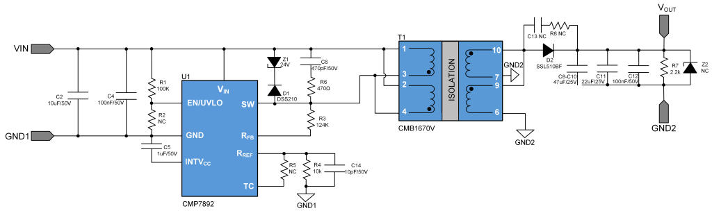 CMP7892+ CMB1670V是一款小型化的隔离电源方案。芯片和变压器配合必要的容阻和整流二极管,可以实现12-24V输入,12V输出10W功率的隔离稳压电源。