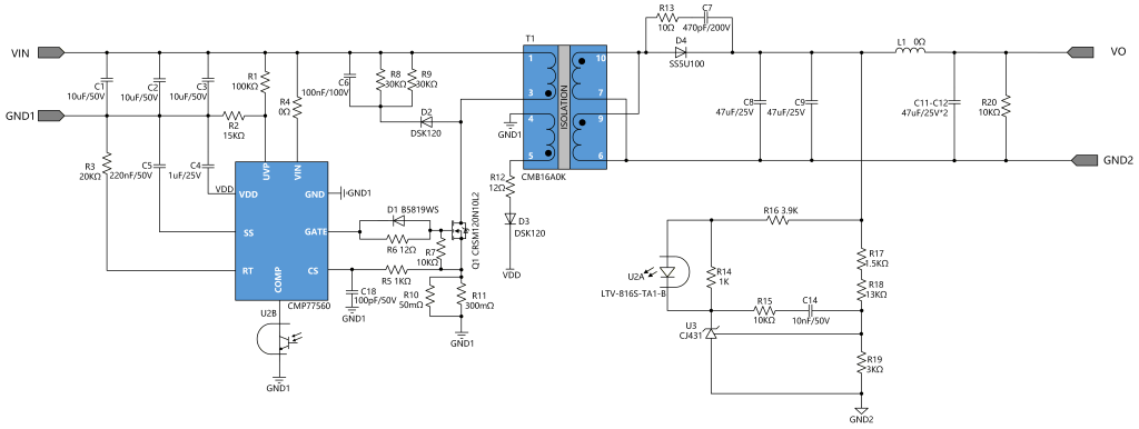 CMP77560+ CMB16A0K 是一款小型化的隔离电源方案。芯片和变压器配合必要的容阻和整流二极管,可以实现 18-36V 宽压输入,14.5V 输出 15W 功率的隔离稳压电源。