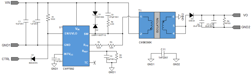 CMP7892+ CMB6398K 是一款小型化的隔离电源方案。芯片和变压器配合必要的容阻和整流二极管,可以实现 9-18V 输入,5V 输出 2W 功率 1.5KV 隔离电源。