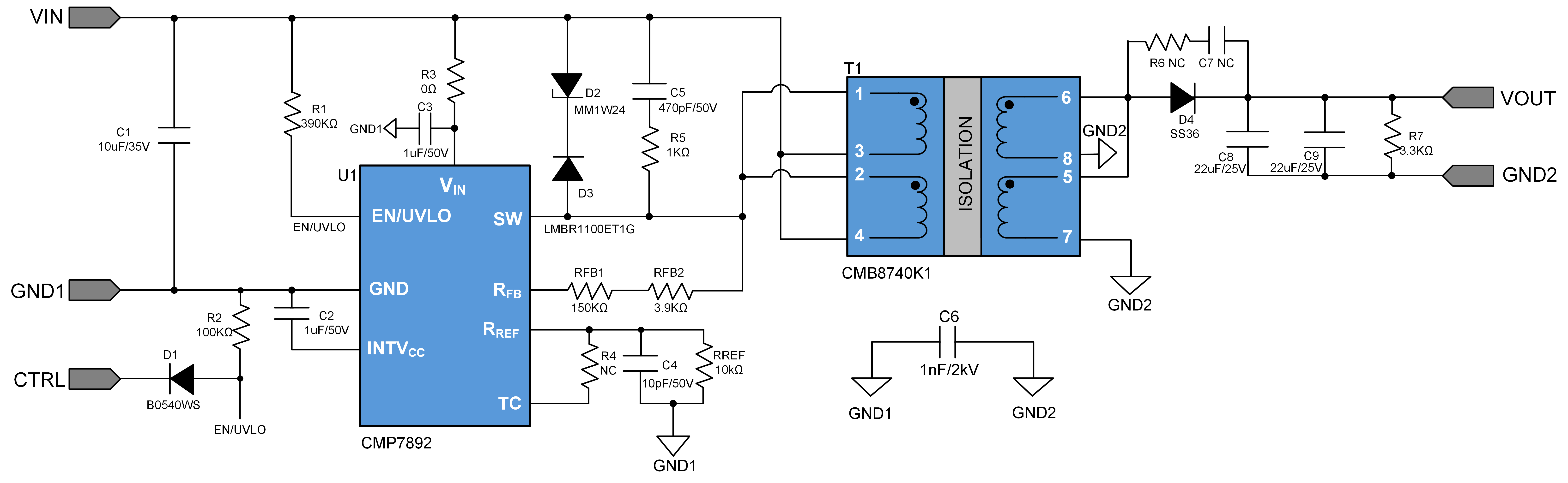 CMP7892+ CMB8740K1 是一款小型化的隔离电源方案。芯片和变压器配合必要的容阻和整流二极管,可以实现 9-18V 输入,15V 输出 3W 功率的隔离稳压电源。