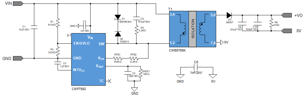 CMP7892+ CMB8768K 是一款小型化的隔离电源方案。芯片和变压器配合必要的容阻和整流二极管,可以实现 18-36V 输入,5V 输出 3W 功率的隔离稳压电源。